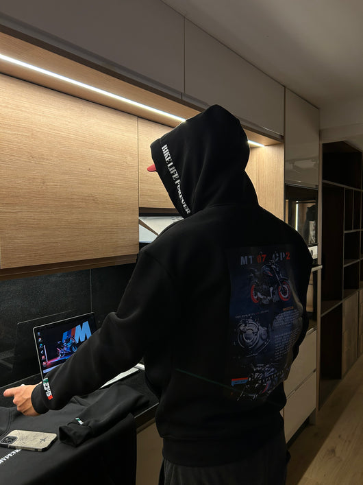 On the back of the hoodie, discover the exclusive design featuring your main ride – or even the bike of your dreams. A unique detail that makes all the difference.